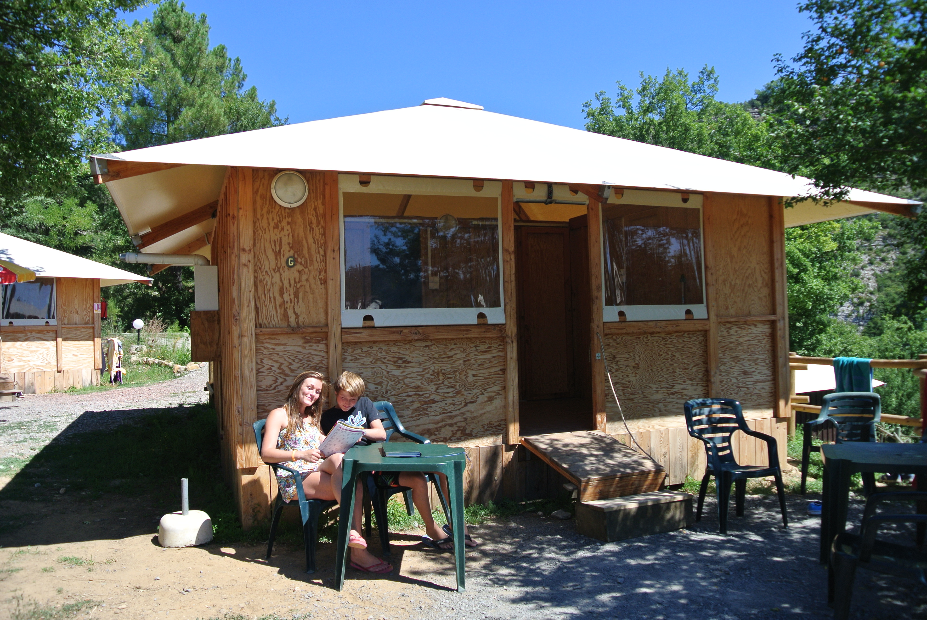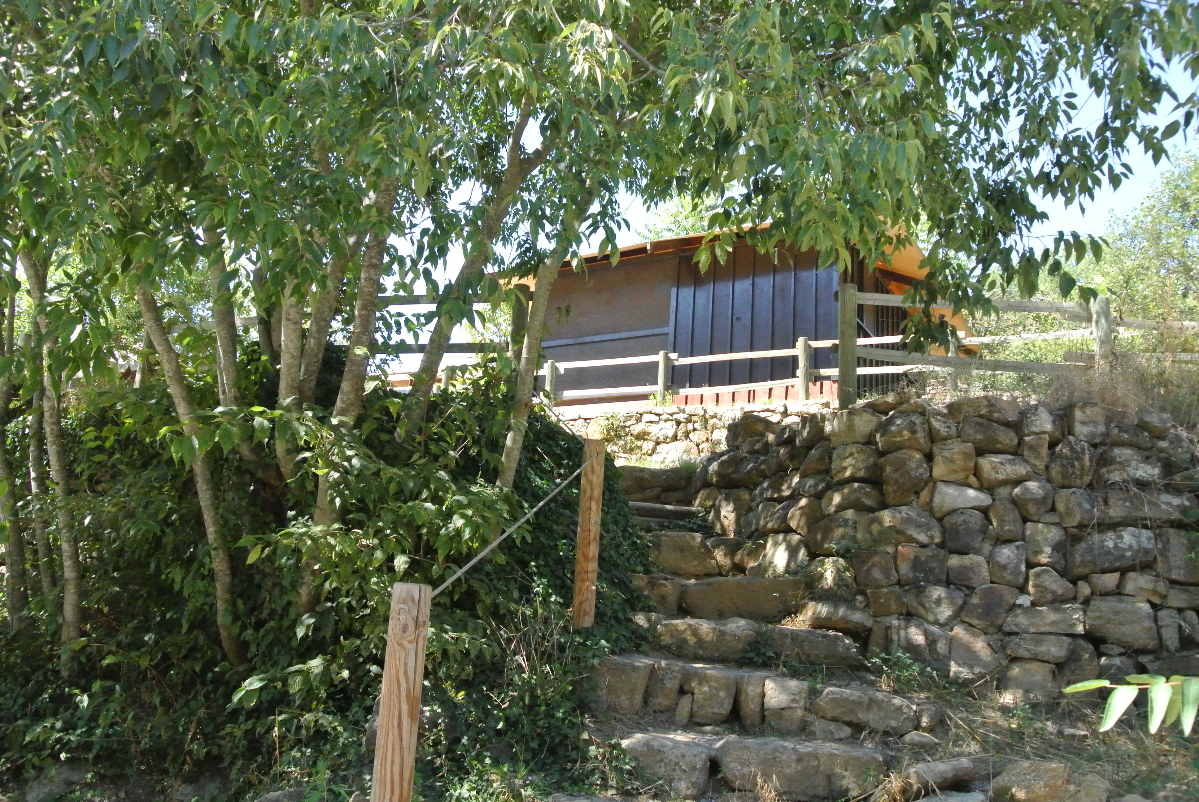 Unsere Hütten,6 Personen,sind leichte Holzkonstruktionen von 25 m²,mit einem Segeltuchdach,Öffnungs- und Schließsystem durch "Zugbrücke" mit Vorhängeschloss,Öffnung in den Räumen durch eine Schiebeklappe. Der Boden und die Trennwände sind aus Holz.
