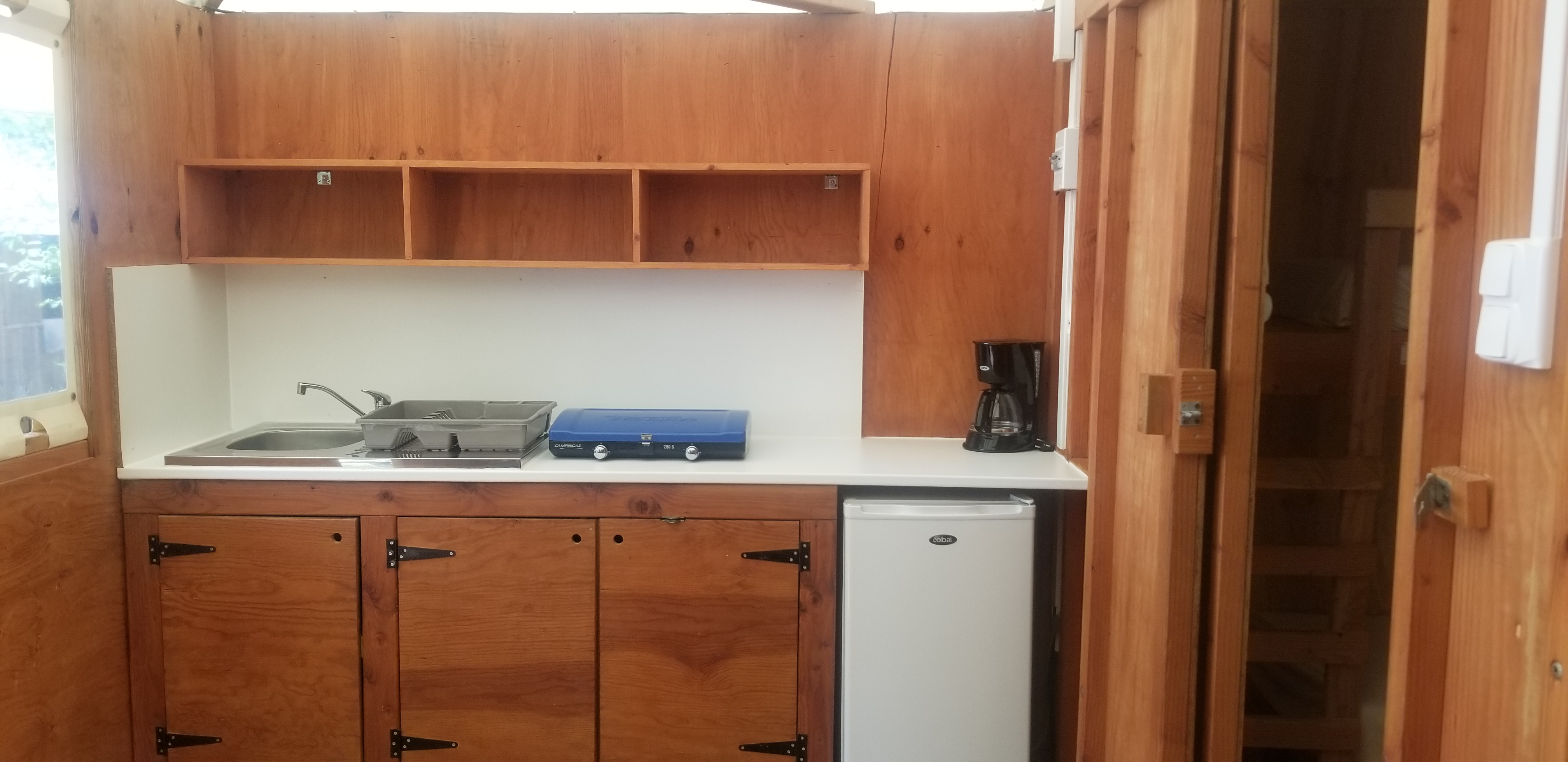 - Kochnische mit 2 Gasplatten,Kaffeemaschine,Kühlschrank oben,Spüle und Geschirr